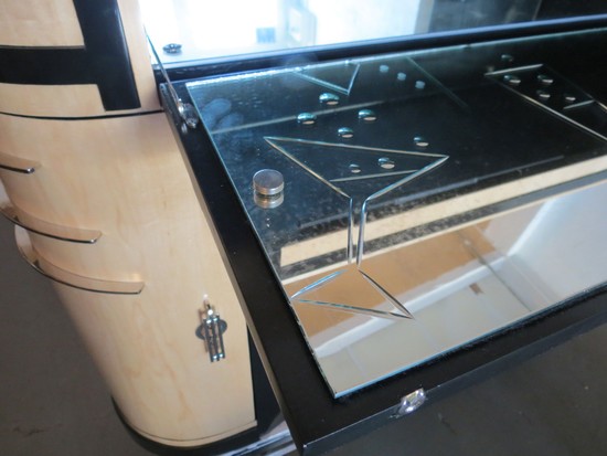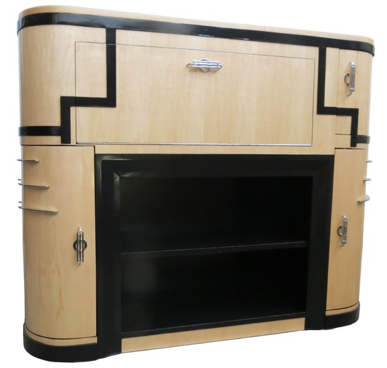 A most striking 1930’s American art deco freestanding bar. The blond maple veneered body is contrasted with black lacquer and nickel handles, speed lines and hinges. The central panel pulls down to reveal an illuminated working bar with mirrored back and working surface with etched cocktail images. Two shelves in black lacquer are for glassware storage, the doors on either side open for bottle storage and the space behind the top right hand door is for bar implements. Overall the bar is 52” wide, 14” deep and 43” high.