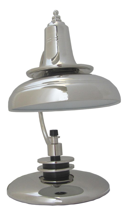 This American art deco bright nickel table lamp was manufactured in the 1930’s by the Markel Corporation in Buffalo, New York. At 14” high it is taller than its little brother (TL 013). It has a domed base and the support is more curved. Both dome shades also are different. The lamp has been replated and rewired.