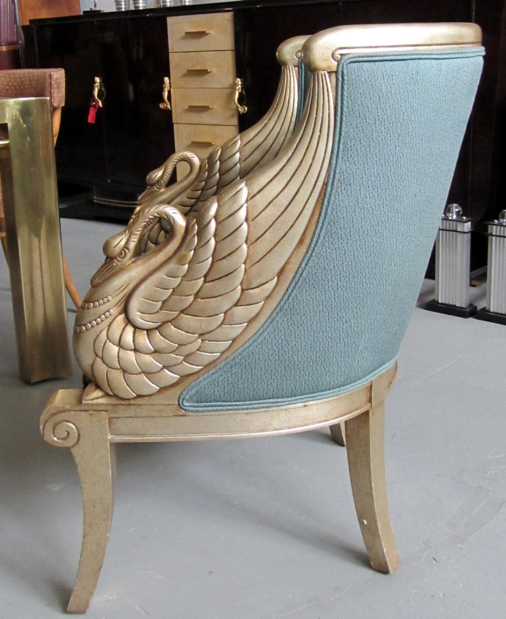 This wonderfully detailed and whimsical pair of American art deco neoclassical silver leaf arm chairs would be the focus of any room. The arms of the chairs are carved swans with their wings extended to the top of the crest rail. The swans, chair back and front and rear saber legs give the chairs a comfortable stance. The blue wool upholstery and the silvered wood are in excellent condition. The chairs are from a prestigious Miami Beach 1930’s Art Moderne home. Each chair is 35” high x 40” wide and 24” deep.