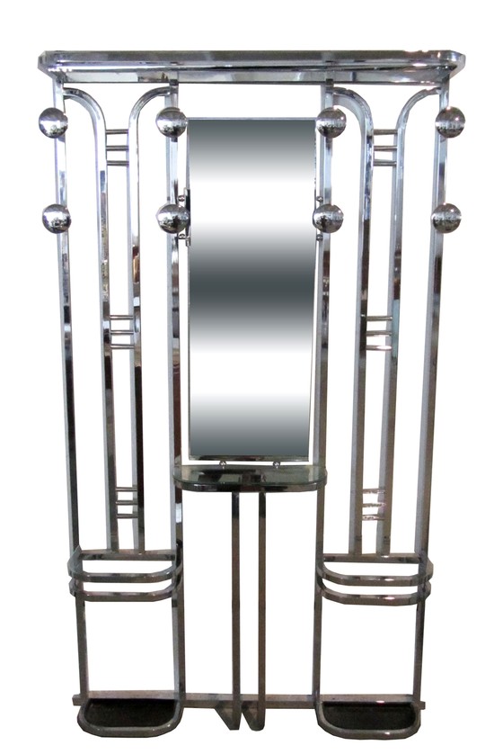 This Spectacular French art deco hall tree is from the 1930’s. Constructed of square aluminum tubing, the stand has a hat rack on top, eight “lollipop” coat hangers, a mirror for checking your tie, a mirrored shelf for keys and separate receptacles for canes and umbrellas. Each umbrella receptacle has a removable black tray to catch water. The aluminum has been polished to a bright shine and the mirrors replaced. A magnificent machine age statement for your entrance, the hall tree is 73” high, 41 1/4” wide and 12” deep.