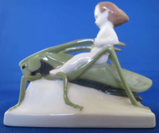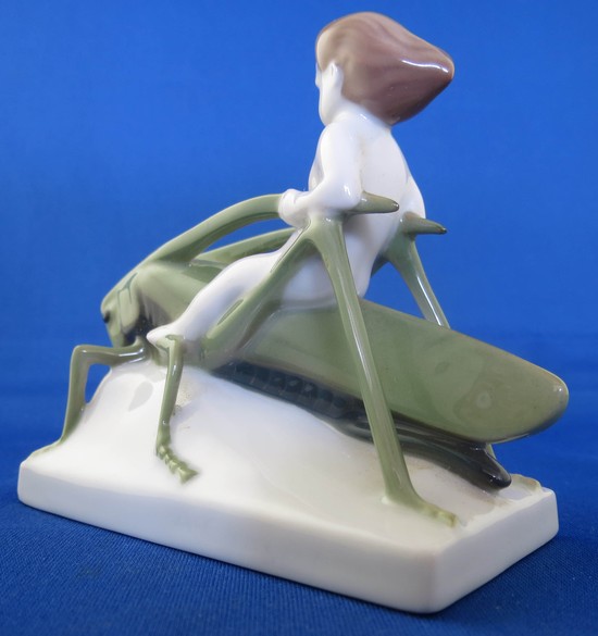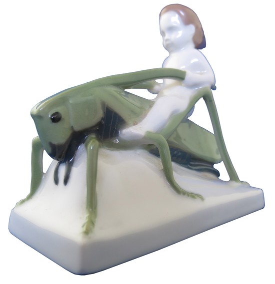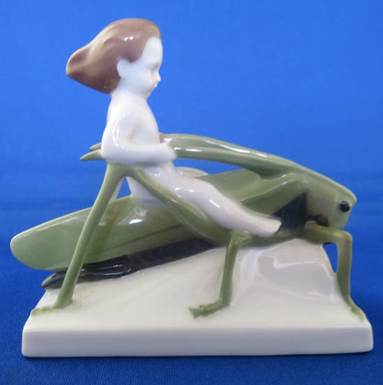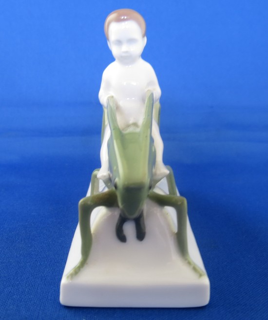 Rosenthal porcelain of boy riding a grasshopper by Albert Caasmann (1886-1968) ca. 1920. The figure is called “sommerritt” in German, summer ride in tagloit. The 3 ½” high, 4” long figure is marked on the bottom “ Rosenthal Selb-Bavaria” in green underglaze. The figure is in mint condition.