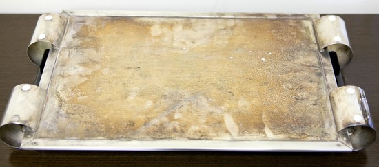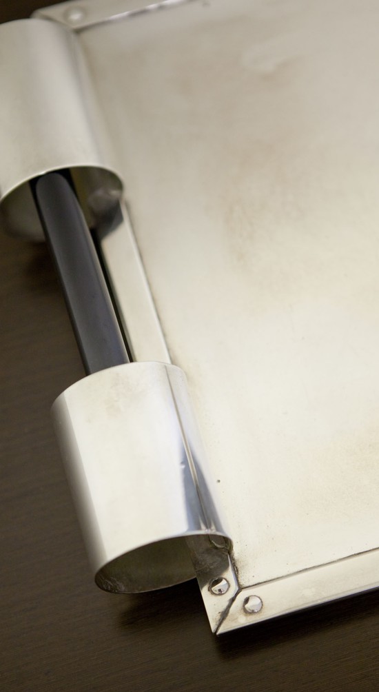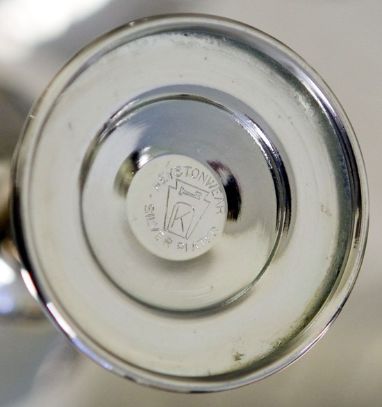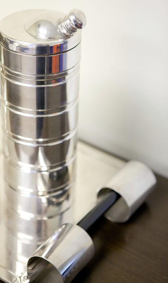 Alfons Bach (1904 – 1999) designed this American art deco silver plate cocktail set for the Keystone Silver Company in the 1930’s. The silverplate tray with its rolled ends surrounding black Bakelite handles is unique in the era’s design vocabulary. The four cups and shaker have “speed” lines incised into the body and the stems. All six pieces are in excellent condition. The tray measures 18” x 10”, the four cups are 4 ¾” high and 2 ½” in diameter. The cocktail shaker is 10 ½” high and 3 ½” in diameter.