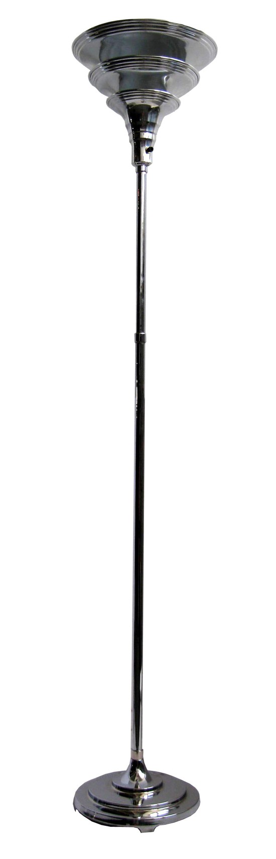 This streamline American art deco torchiere is from the 1930’s. Constructed of aluminum, the sturdy floor light has three stacked shades, each with four “Speed” rings as they expand outward. The sleek shaft rises from a stepped up, weighted base. The torchiere has been polished to a bright silver sheen, rewired and fitted with a 100-150-300 Watt bulb. It stands 66 ½” tall. The top shade is 13” in diameter.
