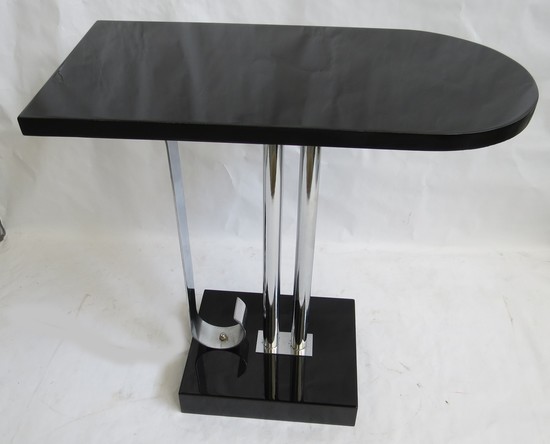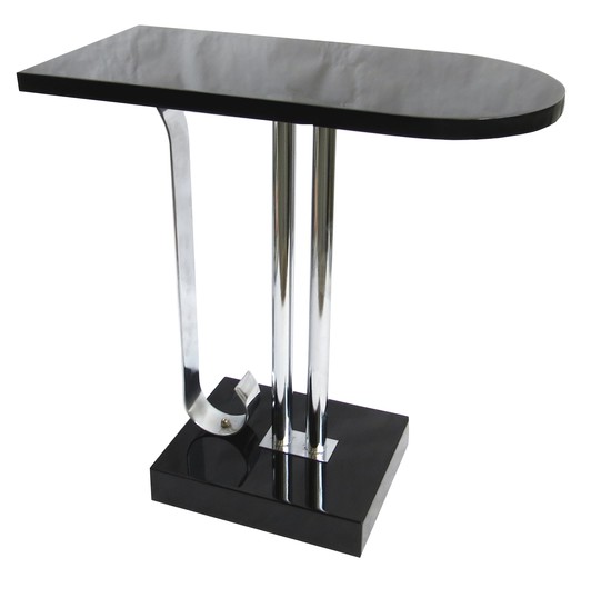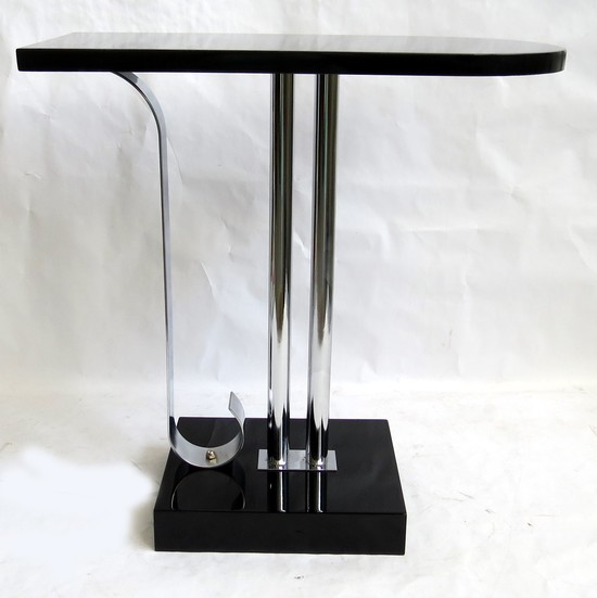 This American art deco occasional table is in black lacquer, nickel steel and Bakelite. The 10 ½” x 8 ½” black lacquer base supports two nickel steel rods and a blat band of nickel steel that curves upward where it meets the base. The black lacquer top is rounded at one end and is 20” x 10”. The table was designed by Charles Hardy for Belmet Products of New York in 1936. the table has been refinished and replated and is in excellent condition. It is 20 ½ high