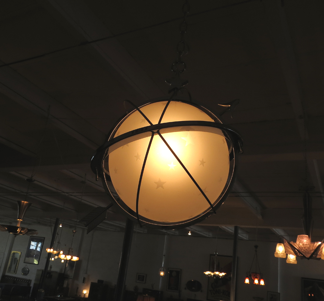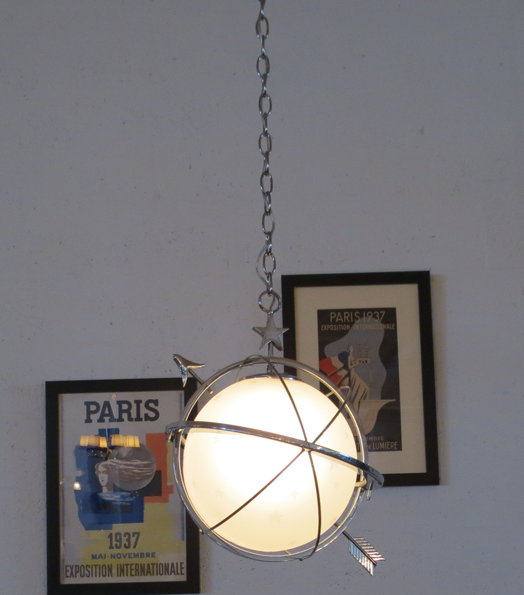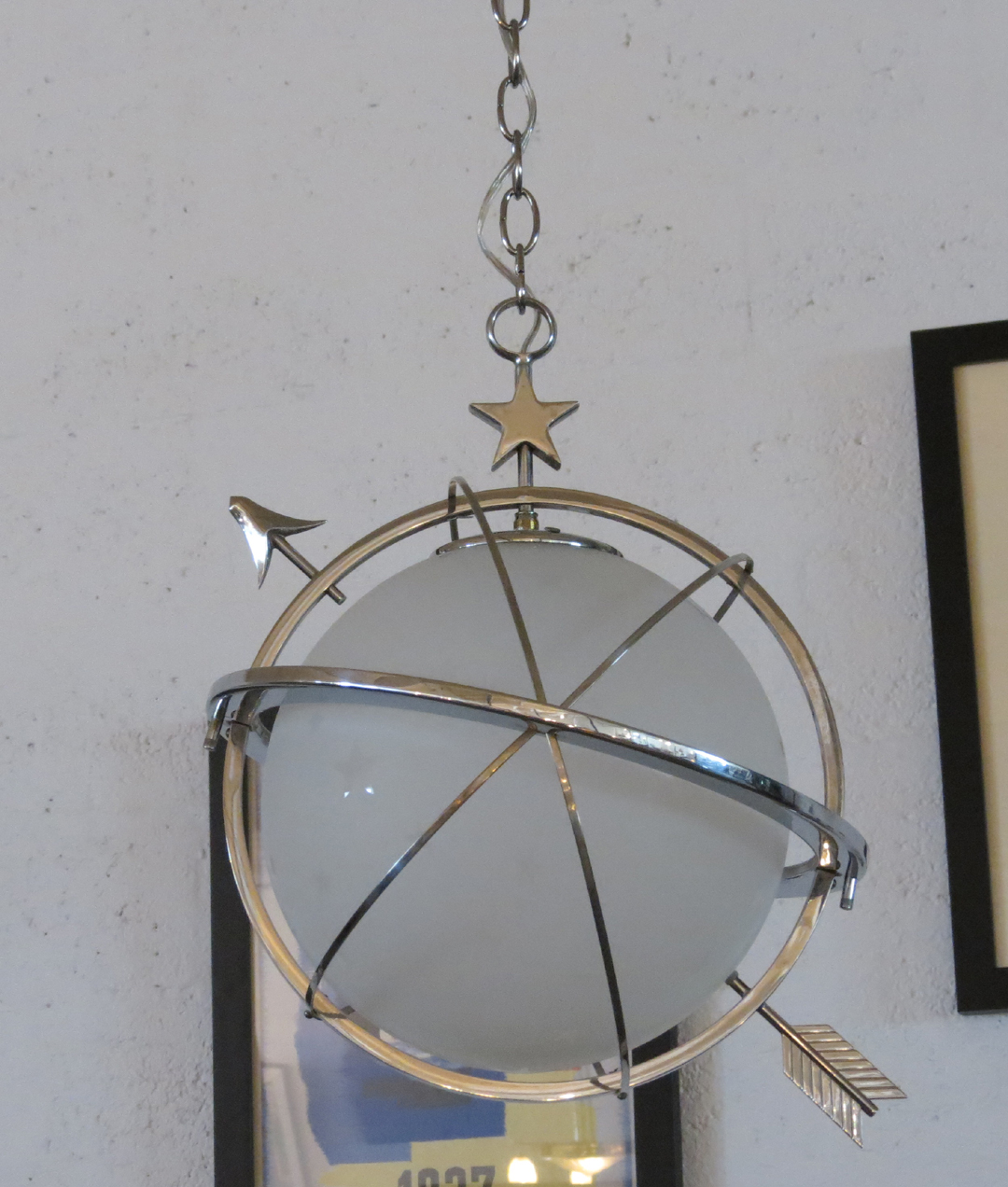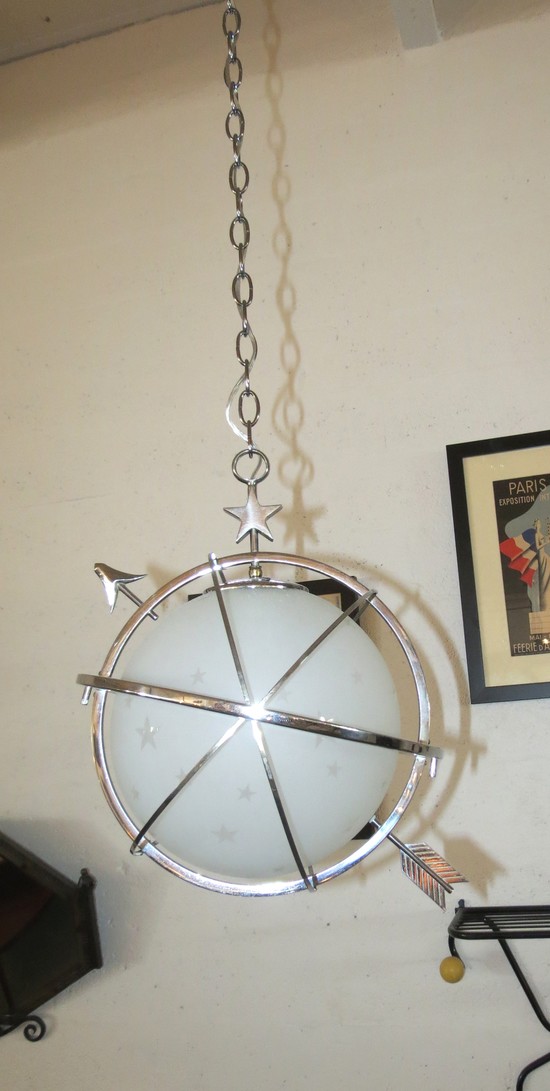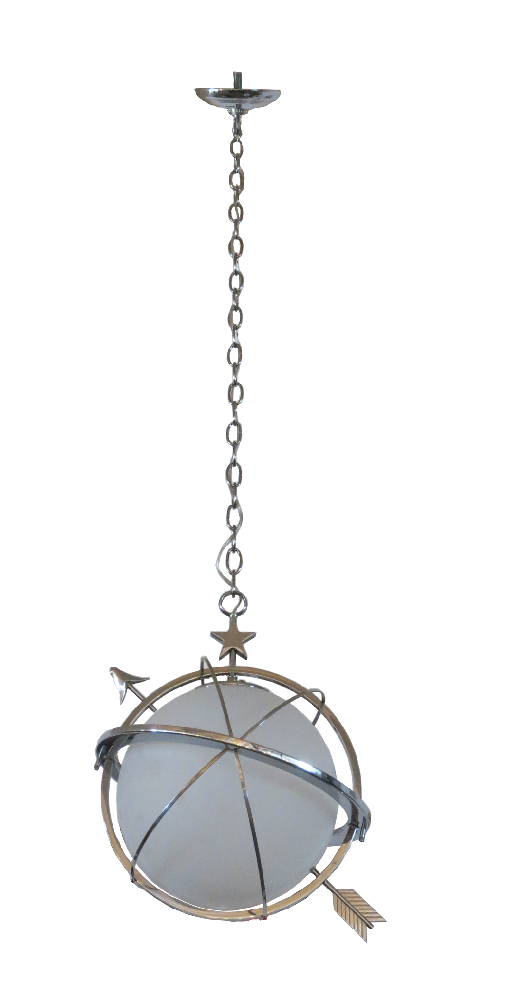 This exceptional American art deco ceiling light is from the 1930’s. A frosted globe etched with stars is surrounded by two chrome circles with two smaller chrome bands crossing. A chrome arrow appears to pierce the globe. A star finial leads the chain to the ceiling cap. The lamp is 14" in diameter and the fixture drops 38" from the ceiling. (this can be shortened to suite your requirements) The lamp is in excellent condition and has been rewired.