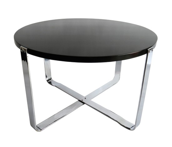 This American art deco coffee table is from the 1930’s. The circular black top is supported by flat bands of chrome steel which cross at the bottom and attach to the sides of the top. The table is 26 ¼” in diameter and 16 ¼” high. It has been freshly lacquered, the metal rechromed and the table is house ready.