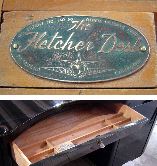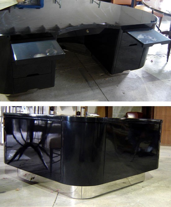 This large and unusual American art deco desk was designed by Frank Fletcher and manufactured by Fletcher Aviation in Pasadena, California. A Design Patent "140,501" was issued to Fletcher in 1945. The desk, which has been refinished in high gloss black lacquer floats on a nickel steel base. The triangular desk has rounded corners, seven drawers with inset pulls and has the brass placque "Fletcher Aviation – Putting Wings on the World" inside the middle drawer. The desk is 72" wide x 48" deep and 30" high .