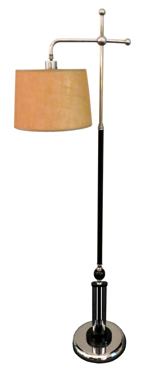 No, it’s not by Donald Deskey! This American art deco floor lamp is from the 1930’s and shares the top superstructure with Deskey’s famous floor lamp. This lamp starts off with a domed chrome base with two chrome bars on a raised black disc. An ebonized ball is held in place with two chrome mounts. A black enameled shaft supports the aforementioned superstructure from which is suspended the original textured shade. The lamp has been rewired and is in excellent original condition and is 58 1/2" tall.
