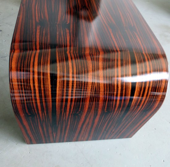 This stunning American art deco coffee table in the form of an inverted "U" is clad in old growth macassar ebony veneers. The table has been lovingly refinished and is in excellent condition. The table is 47" long x 20" wide and 17" high.