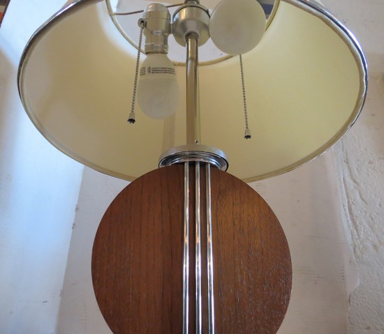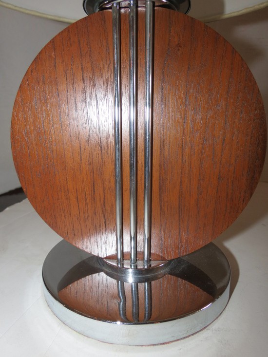 This smart 1930’s American art deco table lamp would fit in about any room décor. The lamp features a flat chrome base and a chrome circle, which supports a circular disk of solid mahogany. A matching chrome circle sits atop the mahogany and three vertical chrome “speed” lines connect the two. The lamp has it’s original stepped finial and a new linen shade. It is 22” high, has been rewired and is in excellent condition.