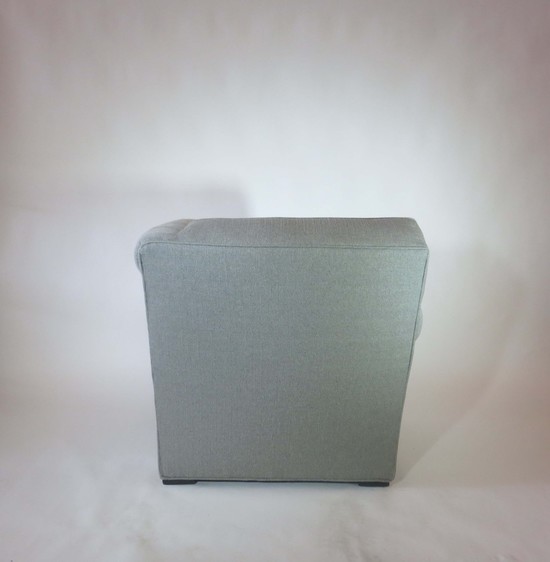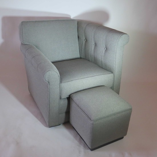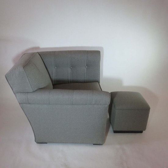 This unusual American art deco asymmetrical chair and ottoman was purchased in 1933 by the original owners from Modernage Furniture New York. The chair had been re-upholstered several times, but the original owner’s son graciously provided a 1939 photograph of him sitting in the chair…we have reupholstered it in the same style and material as original. The chair, with one side higher than the other is very comfortable and allows for a variety of sitting positions. The chair is 36” deep and 32” wide. The tall arm stands at 32” high, the low arm is 23” high and the seat height is 18”. The ottoman stands at 15" high, and is 14 1/2" by 14 1/2".