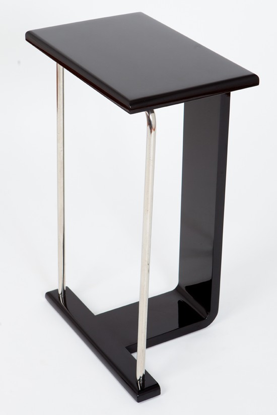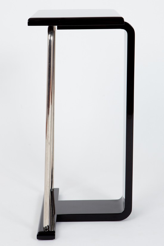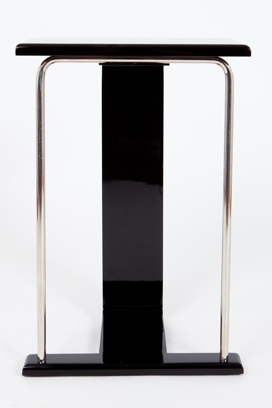 This 1930’s American art deco occasional table is a perfect place to display a prized object or perhaps a vase of colorful flowers. The table in black lacquered wood and chrome steel tubing is 24” high, 16” wide and 12” deep. It is in great original condition