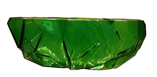This American Art Deco bowl was designed in 1927 by Reuben Haley for the Consolidated Glass Company of Corapolis, PA. His Ruba Rombic line was introduced in 1928 and retired in 1933. It has been estimated that only 1500 pieces of Ruba Rombic have survived. This piece is the oblong bowl (also called the banana bowl) and it is in a striking jungle green and is 12” long and 4-1/8” high.