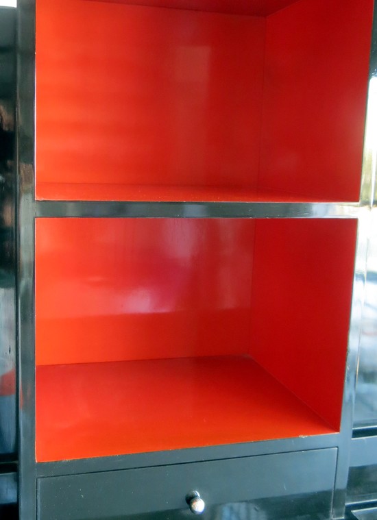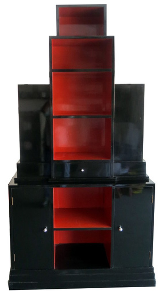 This American art deco bookcase in the Skyscraper style was made by Modernage. It is shown in a brochure they produced titled “Shadows of Magnitudes” between 1929 and 1933. In it they state that it is inspired by Hugh Ferris (Hugh Ferris 1889 – 1962) the famous American delineator, but the obvious inspiration was Paul Frankl, whose Skyscraper bookcases were the rage of that period. The bookcase is constructed of black and red lacquered wood and contains numerous cubbyholes, doors and drawers as it rises skyward. The bookcase is in two parts for easy handling and is 75” high x 41” wide and 16” deep.