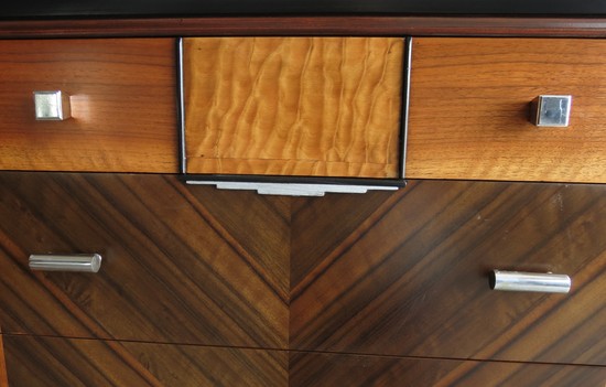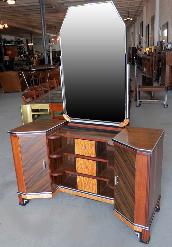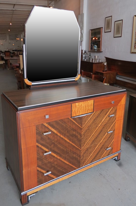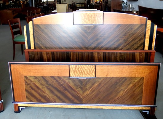This stunningly beautiful skyscraper design American art deco bedroom set was made by Northern Chicago Furniture Company in the late 1920's. Constructed of exotic veneers of macassar ebony, walnut and birdseye maple with silver leaf and ebonized wood accents with chrome pulls and handles. It consists of a full size bed, vanity and stool, low chest with mirror and a tall chest. The two mirrors are beveled. The set has been restored and is in excellent condition. The low chest is 48” wide, 21” deep and 34” high (excluding the mirror which is 31 ½” high), the tall chest is 35 wide, 21” deep and 50” high, The vanity is 64” high including the mirror, 45 ¼” wide and 17” deep and the vanity stool is 26” wide, 13” deep and 19 ½” high. The headboard is 57” wide and 42” high.