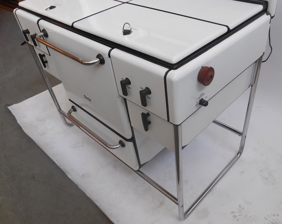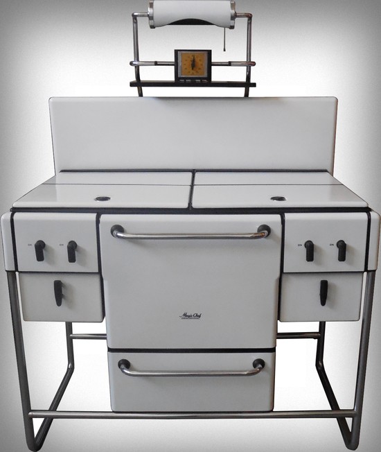 An American art deco stove, oven, and griddle. This Magic Chef stove is by the American Stove Company Saint Louis, Missouri and was made in 1936 and is in excellent condition. It is in white porcelain over cast iron with chrome steel supports and handles for the oven and under storage. The porcelain is in excellent condition, the support chrome is bright and shiney it even has the “Magic Chef” logo and the original on-off and warning decals are intact. The light above the stove works as well as the timer. The stove is 46” wide, 30” deep, and 60” high. A similar stove is in the collection of the Wolfsonian Museum, Miami Beach, Florida.