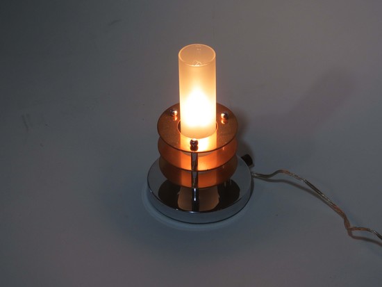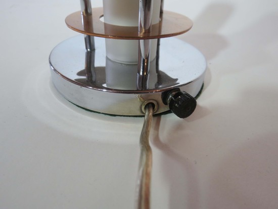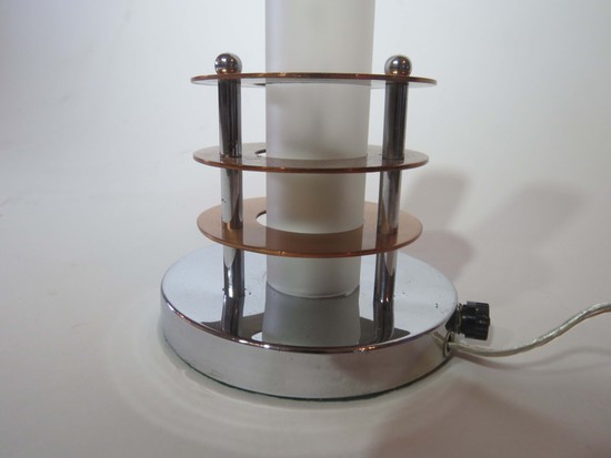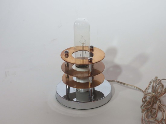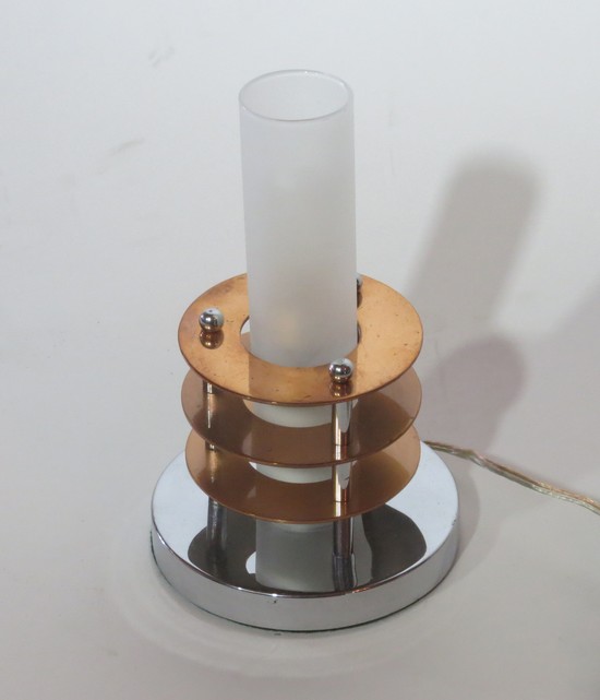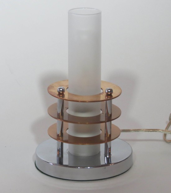This sweet little American art deco table lamp is from the 1930’s and bears a resemblance to Flash Gordon’s “ray gun”. The chrome base has three chrome rods held on with chrome balls. Three copper rings encircle the frosted glass tube which illuminates when the switch on the base is turned on. The lamp is 7 ½” high and 4 3/4” in diameter at the base. It is in excellent condition and has been rewired.