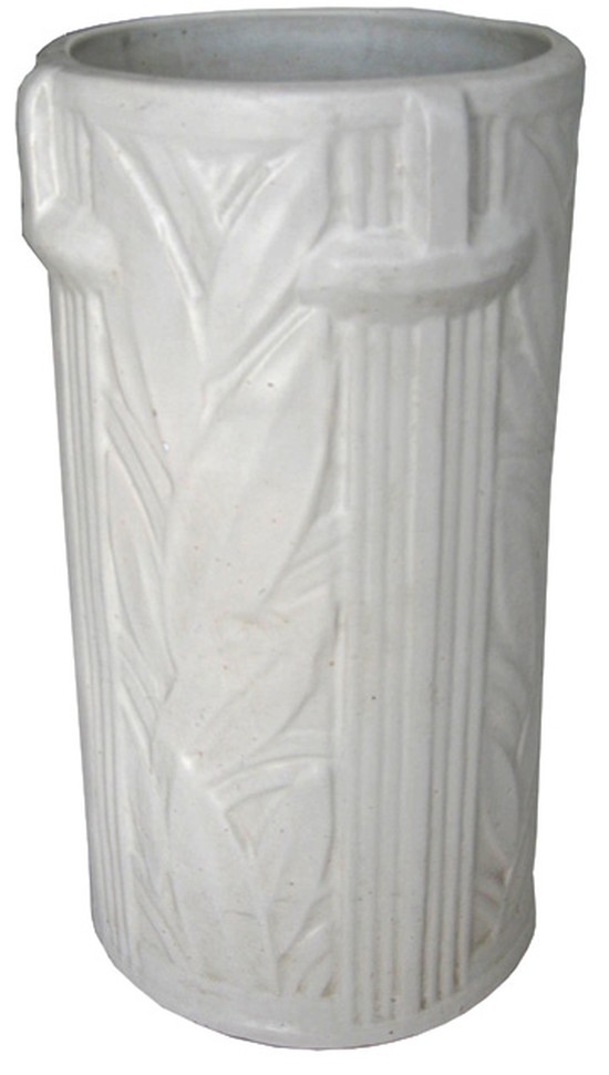 This American art deco white ceramic umbrella stand was made by the Robinson Ransbottom Pottery Company at Roseville, Ohio in the 1930’s. The umbrella stand is decorated with vertical lines and a geometric leaf pattern and four handles. It is in excellent condition and is 18 ¼” high and 10” in diameter.