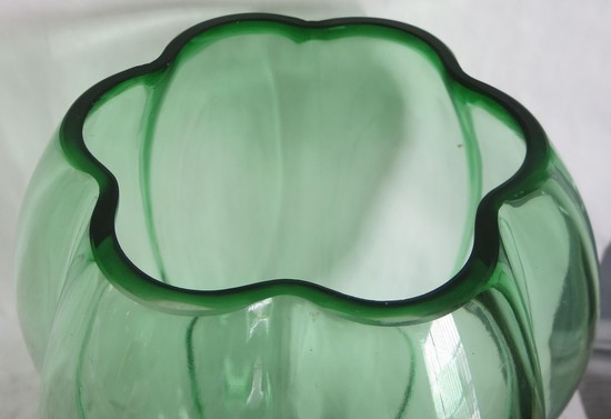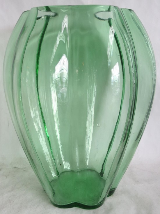 This rare American art deco vase was designed by George Sakier (1897-1988) for the Fostoria Glass Company, Moundsville, West Virginia. The vase is number 2408 in the company literature. The form was introduced in 1930 and is in the green color which was discontinued in 1941. A vase of the same form is in the British Museum in London. The vase is in excellent condition with the exception of a small bubble in the glass from manufacture. The vase is 8 ¼ high.
