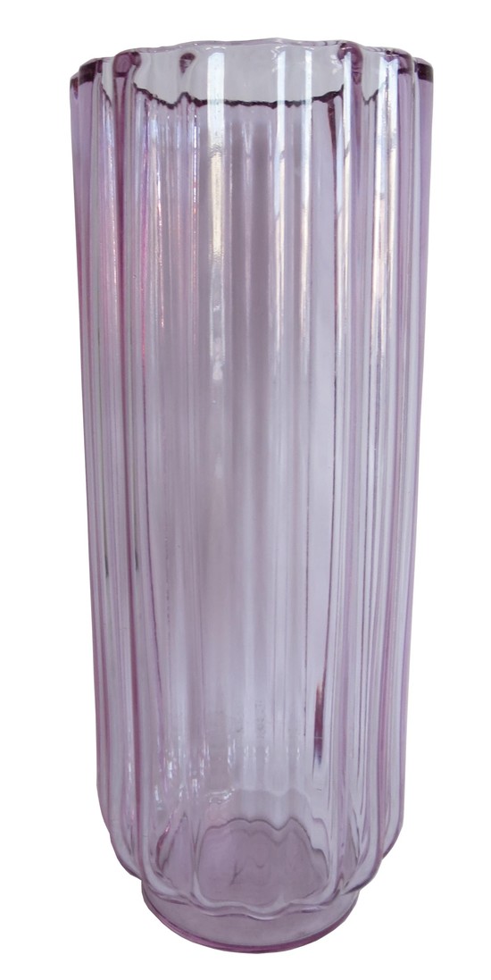 This American art deco vase was designed by George Sakier (1897-1988) for the Fostoria Glass Company, Moundsville, West Virginia in 1929. The Vase number 2428 in the company literature is in the rare wisteria color and is 9 3/8" tall. It is in perfect condition.
