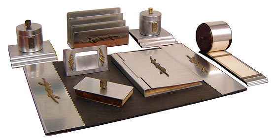 This American Art Deco aluminum with brass trim desk set was designed in 1934 by Lurelle GuildLurelle Guild
