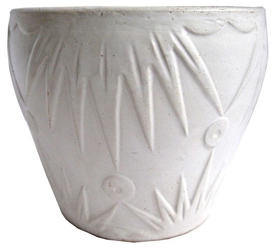 This American art deco white ceramic planter was made by the Robinson Ransbottom Pottery Company at Roseville, Ohio in the 1930’s. The planter has very geometric floral and foliate décor and is impressed on the bottom “RRPCo., USA”. It is in excellent condition and is 9” high and 10” in diameter.