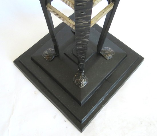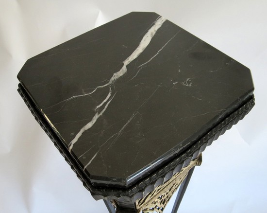 This 1920’s American Art Deco pedestal is constructed of hand wrought iron and has a marble top. From a stepped base four arms rise, connected by three square silver polished iron rings. The apron is of silver polished iron in a variety of 1920’s Jazz Age motifs. The top is a square of polished black marble with white streaks. The symmetry of the form is balanced by the contrast of black and silver to create and object which will enhance any home. The pedestal is 42” high and sits on a 10 ½” square stepped base. The marble top is 9 ½” on each side.