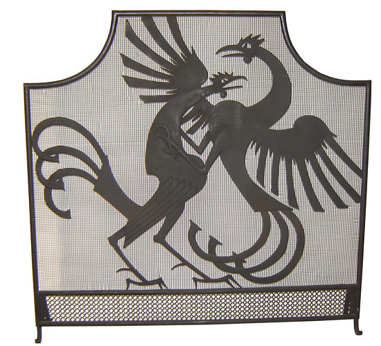 A dynamic American art deco iron fire screen in the style of William Hurt Diederich (1884-1953). The screen, which is from the 1920’s, features two fighting cocks on a mesh background above a chain-link border. The wrought iron surround sets on simple arched feet. The screen measures 40” wide and is 39” high.