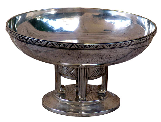This American art deco silverplate tazza dates from the late 1920’s or early 1930’s and combines modern style and motif and a classical form. The bowl is marked “Apollo” with a cartouche containing a seated lion and the letters “VH” and another cartouche containing the number 25. The tazza is 11 ½” in diameter and is 6 ¼” high.