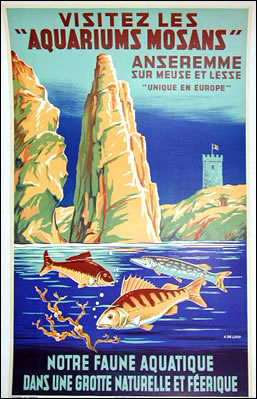 A Belgian art deco stone lithographic poster for Anseremme, a town on the River Lesse in the Province of Namur. The town is famous for its Grotto which boasts a multitude of fish. The poster was designed by A. De Loof ca. 1938 and was printed by Morjos Gand. It measures 39" x 25".