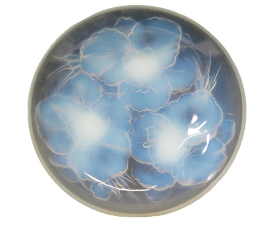 This French Art Deco signed opalescent glass bowl was produced by the Parisian firm of La Societe Anonyme Edmond Etling which was founded after WWI in Paris, France and made at the Choisy-le-Roi glassworks which were located just outside of Paris. The beautifully molded 1” thick glass pattern of geraniums is on the base of the bowl and the petal clusters serve as the feet of the bowl, leaving the inside of the bowl with a smooth surface. Etling produced the work of some of the top designers of the Art Deco era. Geza Hiecz and Georges Beal were some of the Etling designers as well as Lucille Sevin, Genevieve Granger, Maurice Guiraud and Demetre Chiparus. The company did not survive WWII so all its production was in the 1920’s and 1930’s. The bowl is marked “Etling France 146” in the mold. The “146” pertains to the catalog number assigned to it by Etling. The diameter of the bowl is 11 ¾” and it’s 2 ¾” tall. $ 1,250.00 SALE PRICE: $ 750.00 /