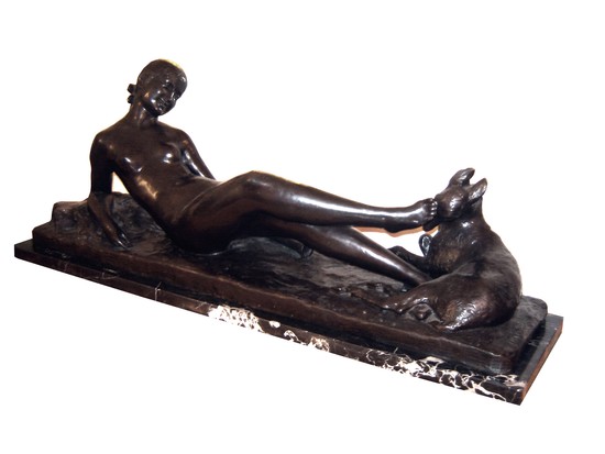 This lovely French art deco bronze sculpture is by Ary Jean Leon Bitter (1883-1942). The bronze, with a greenish brown patina, depicts a nymph reclining on a thicket of leaves and tickling a small deer with her feet. The nymph holds a flute in one hand and gazes at the deer with delight. The bronze sits on a classic black with white marble base and is signed “Ary. Bitter”. The base measures 35” long and 9” deep. The bronze sits 13” high.