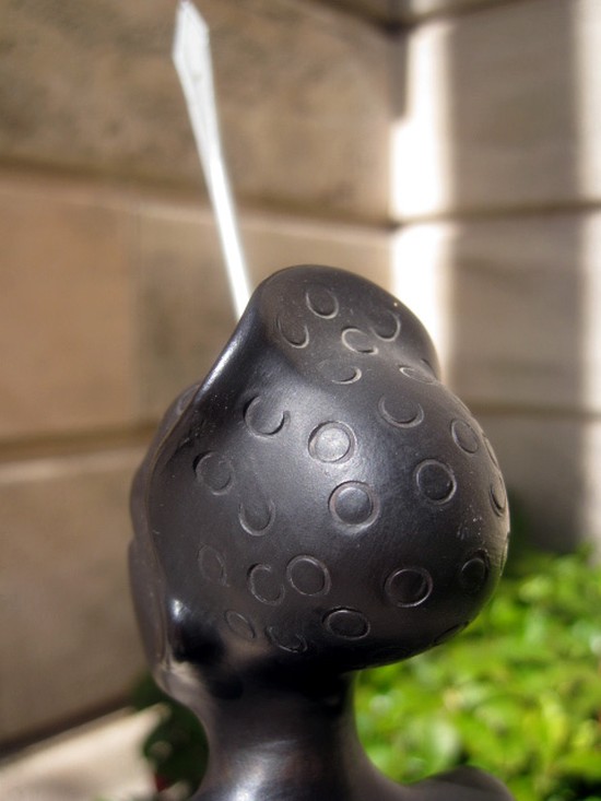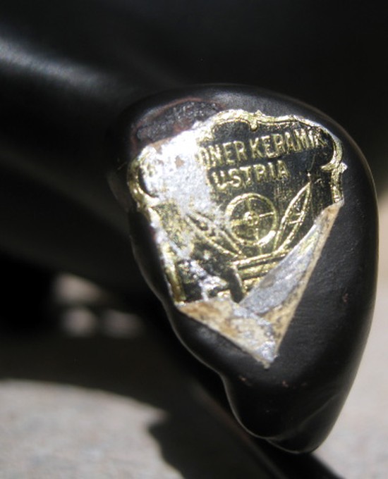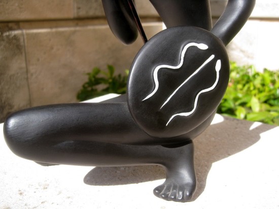 This elegant female African Warrior figure is a 1930’s creation of Gmunder Keramik of Austria. The terracotta lady is in a black matte glaze unrelieved but for the red lips and a white undulating design on her shield. The remains of a Gmunder Keramik paper label is under her right foot and “52311” is incised under her left foot. The kneeling figure is 12 ½” high, 19” high to the tip of the metal spear.