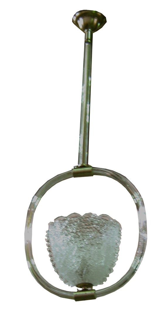 Made in the 1930’s, this Barovier & Tosso ceiling light is constructed of bronze and blown glass. A ribbed glass rod hangs from the bronze ceiling cap and holds a circle of ribbed glass. Centered in the glass circle is a bowl of Murano glass with reticulated top and applied glass fringe. This quality fixture, which drops 37” from the ceiling and is 16” in diameter, has been rewired for American electricity and is ready for your home.