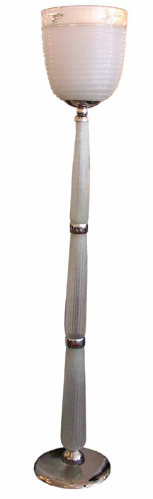 A spectacular art deco torchiere from the Murano glass maker Barovier. The shaft, which consists of three tapering bulbous smoke glass sections with included bubbles, sits on a nickel base and is spaced by two nickel collars. A nickel cap supports the bowl of matching glass with a 2 ½” clear rim at the top. The torchiére is in excellent condition and stands 72” high and has been rewired for American electricity.