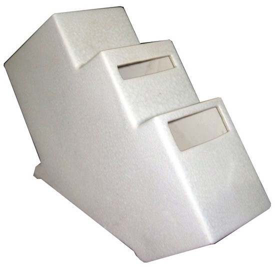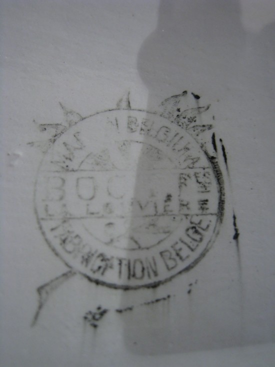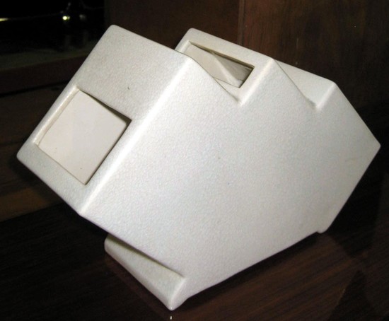 This white Faience Belgian art deco geometric vase is a design of the Charles Catteau workshop (Atelier de Fantasie) at Boch Freres. The form design dates from 1928 and is known as # 1043. The unusual stepped vase has four openings for flowers or greens and measures 9 ½” high, 15” wide and is 5” deep. It is marked on the bottom with the Boch seal and it is pictured on page 292 of Art Deco Ceramics Made in Belgium – Charles Catteau.