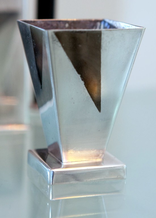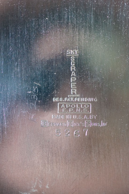 This American art deco silverplate on copper and brass cocktail shaker and two cups were designed by Louis W. Rice for Bernard Rice’s Sons in 1928. The shaker with its stepped up top and “black smokestacks for handles”, along with the two wedge shaped cups are all from the Skyscraper line of the Apollo Studios Division. All three pieces bear the manufacturer’s marks. The shaker is 11 ½” tall and the cups are 3 3/8” high.