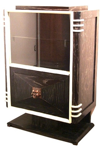 This is one of the more unusual French art deco display cabinets we have seen. The wood is limed and ebonized oak with white trim. The pull on the lower door is a hand carved face. The cabinet measures 33" wide x 22" deep x 51 1/2" high