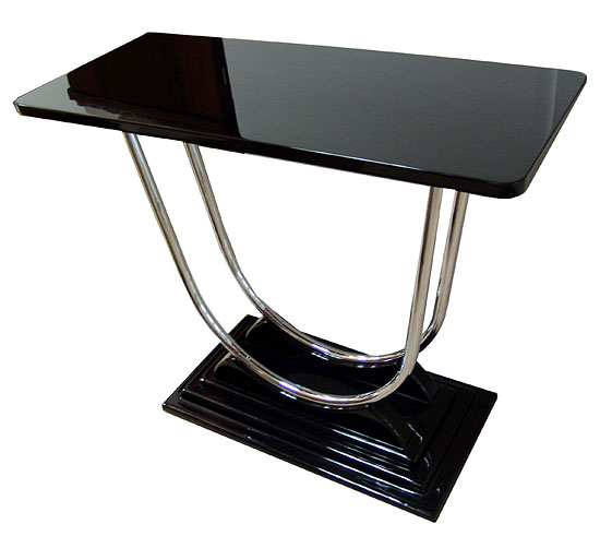 This sleek American art deco black lacquer and nickel plated steel console dates from the 1930’s. the base skyscrapers up to twin bright nickel supports and a black lacquer top. The top measures 36” x 15” and the console stands 30 ½” high.
