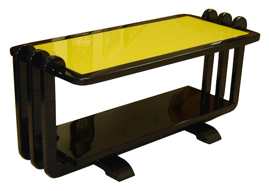 We don’t know who designed this American Art Deco coffee table, but it is stunning! The table which sits on lap feet with a lower shelf and six curved supports is finished in high gloss black lacquer. The center of the top shelf is a sheet of yellow Vitrolite glass inset into the black lacquer frame. The table measures 36” long x 15-1/4” wide and is 16-3/4” high. The table top is 15” high.