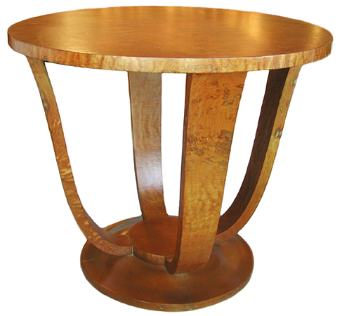 This sculptural French art deco occasional table dates from the 1930's. Of blond burl veneers, the table features four softly curving supports above a domed base. The table measures 27 1/2" in diameter and stands 24" high