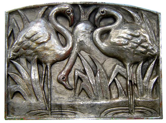 This large American art deco cast bronze panel dates to the 1930’s. Three flamingoes stand among geometric foliage in high relief. The bronze is nickel plated and has a wonderful patina with the bronze showing through on the birds’ beaks, necks and wings. The panel, which was inset into an exterior wall, measures 23 ½” high and 31 ¼” wide. The rim is 1” thick and it weighs 96 pounds.
