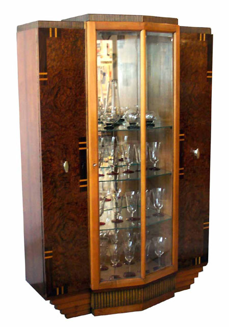 An American art deco vitrine with a door on each side and a “V” shaped center door. The side doors are of Burlwood veneer inlaid with macassar ebony and sycamore, they open to reveal glass shelves. The center door has two beveled glass windows and covers three glass shelves and a mirror back. The top and base of center section are ribbed beech with the depressions ebonized. The side compartments rest on reverse pyramid feet. The vitrine measures 67 ½” high, 17” deep and 45 ½” wide.