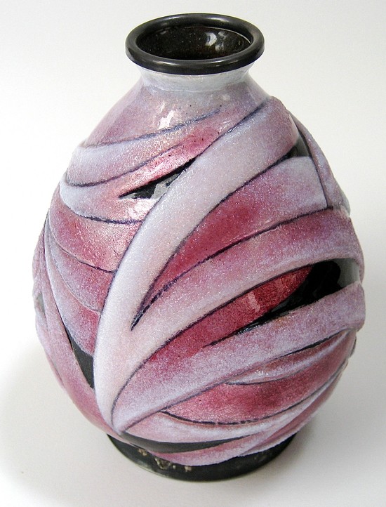 This superlative French art deco vase is Atelier Camille Faure and was designed by Andree Faure (1904 – 1985). The vase, in transparent to bold red enamel combined with pure white to a feathery pink enamel with areas of pure black, creates a dramatic geometric point and counterpoint. The enamel, in high relief, is laid over silver foil to magical effect. Created ca. 1940, the vase is signed “C. Faure Limoges” and is pictured in Cork Marcheschi’s book, Camille Faure: Impossible Objects on page 163. The vase measures 5 ½” high and is 4” in diameter.