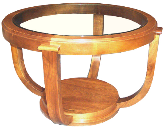 This French art deco table features four curved supports and an inset glass center. Constructed of walnut, the table dates from the 1930's and measures 32" in diameter and stands 23 ½ high.