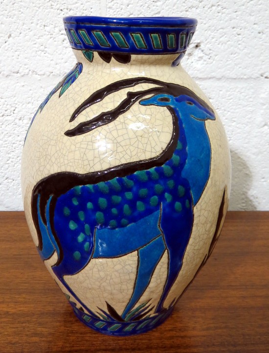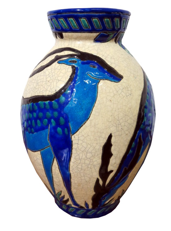 This striking Belgian Art Deco vase is one of a series of shapes and forms on the theme "Biches Bleues" that Charles Catteau (1880 -1969) created in 1925 for Boch Freres in La Louviere, Belgium. The line was first exhibited at the 1925 Exposition Internationel Arts Decoratifs et Industriels Modernes in Paris. Enameled in shades of dark and light blue with green on a craqueleured white ground, the vase portrays deer in various positions. Arguably Catteau's most famous design, the deer became an icon of the Art Deco Era, known in the company literature as Design # 943, the design was used from 1925 into the 1940's. Biches Bleues is pictured in the book "Catteau" on pages 25, 38, 55 and 234; on page 62 of the book "L'Homme de Keramis, Charles Catteau; on pages 18, 33, and 48 of the book "Ch Catteau, La Louviere Formes & Techniques". In the book "Art Deco Ceramics Made in Belgium Charles Catteau", Biches Bleues apperas on pages 114 and 274. The vase is 9 1/2" high and is impressed on the base "1264". It is also marked "29X" and is in excellent condition.
