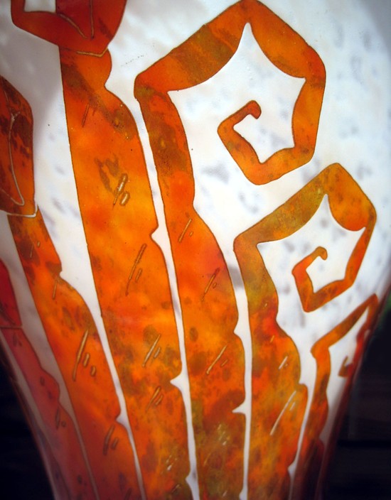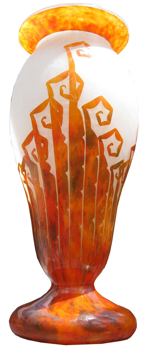 The glass that Schneider produced marked Le Verre Francais (the glass of France), and Charder, was made of two contrasting layers of colored glass. Part of the outer layer was cut away in various Art Deco motifs by acid etching, to reveal the...