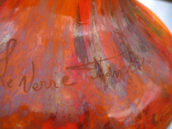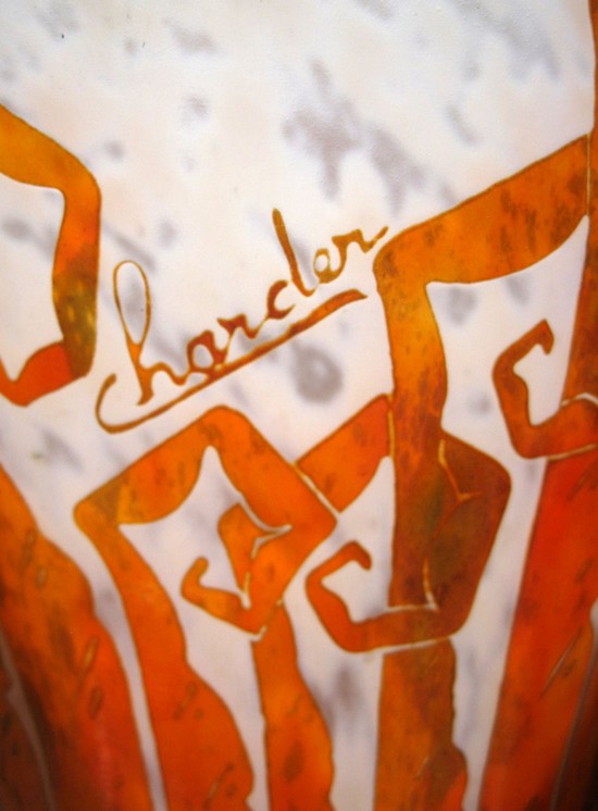 Art glass by Schneider was originally signed Schneider, Le Verre Francaise, or Charder (a contraction of Charles Schneider). Occasionally, it was signed with the inclusion of a small candy-cane of striped glass in the base.