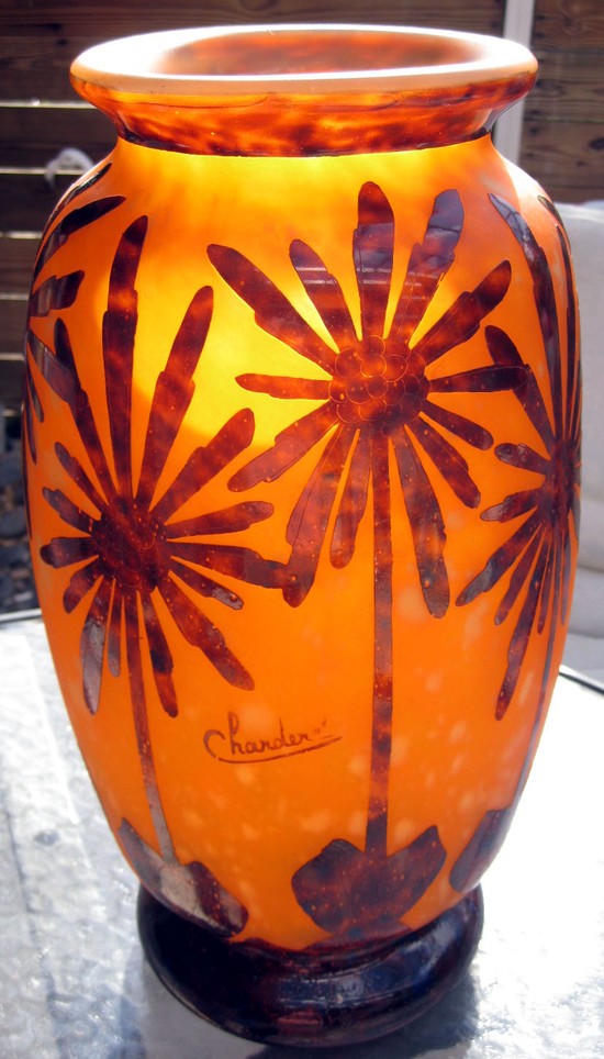 The glass that Schneider produced marked Le Verre Francais (the glass of France), and Charder, was made of two contrasting layers of colored glass. Part of the outer layer was cut away in various Art Deco motifs by acid etching, to reveal the...