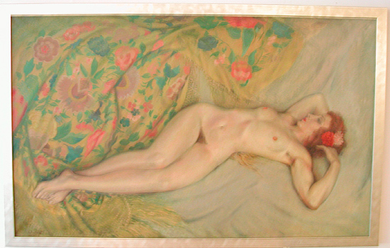 This oil on canvas by Edouard Chimot (1890 - 1959), French, portrays a young French woman in a Matisse-like setting with special attention to the print fabric and folds of the linen. Chimot illustrated "L'enfer" by Barbusse, "Le Spleen de Paris" by Beaudelaire and books by Bandu, Cuel, Isarlov, Louys, Magree, Maourois, Pantorni and Tinian. The painting measures 31 1/2" x 51" and is signed "Chimot" on the lower left.